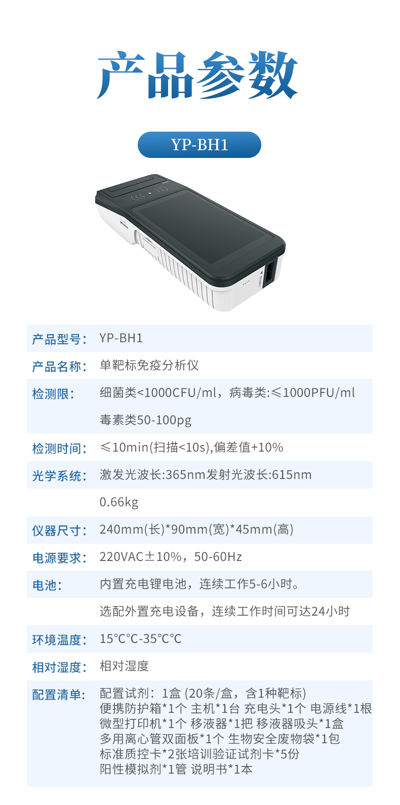 便攜防護(hù)箱*1個 主機(jī)*1臺 充電頭*1個 電源線*1根 微型打印機(jī)*1個 移液器*1把 移液器吸頭*1盒 多用離心管雙面板*1個 生物安全廢物袋*1包 標(biāo)準(zhǔn)質(zhì)控卡*2張培訓(xùn)驗證試劑卡*5份 陽性模擬劑*1管 說明書*1本