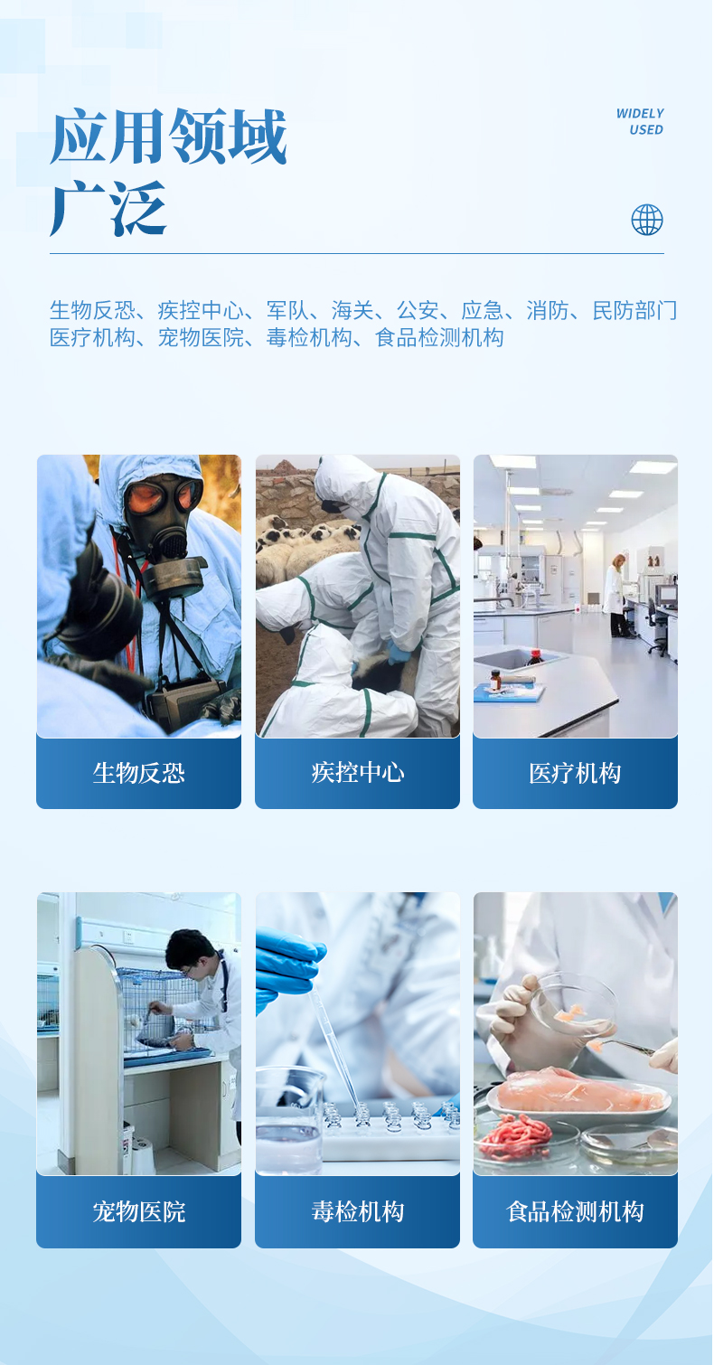 生物反恐、疾控中心、軍隊(duì)、海關(guān)、公安、應(yīng)急、消防、民防部門、寵物醫(yī)院、毒檢機(jī)構(gòu)、食品檢測(cè)機(jī)構(gòu)