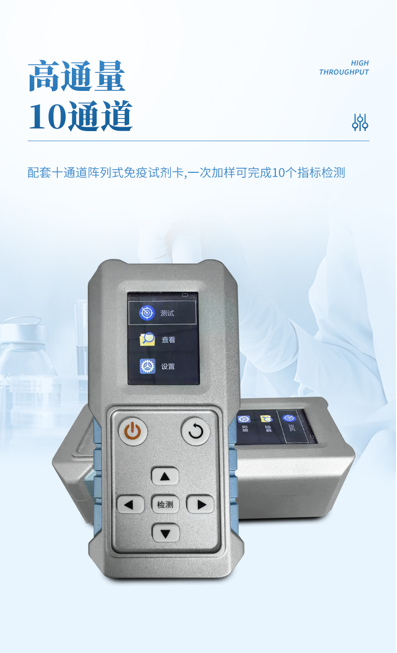 高通量 — 配套十通道陣列式免疫試劑卡,一次加樣可完成10個(gè)指標(biāo)檢測(cè)。