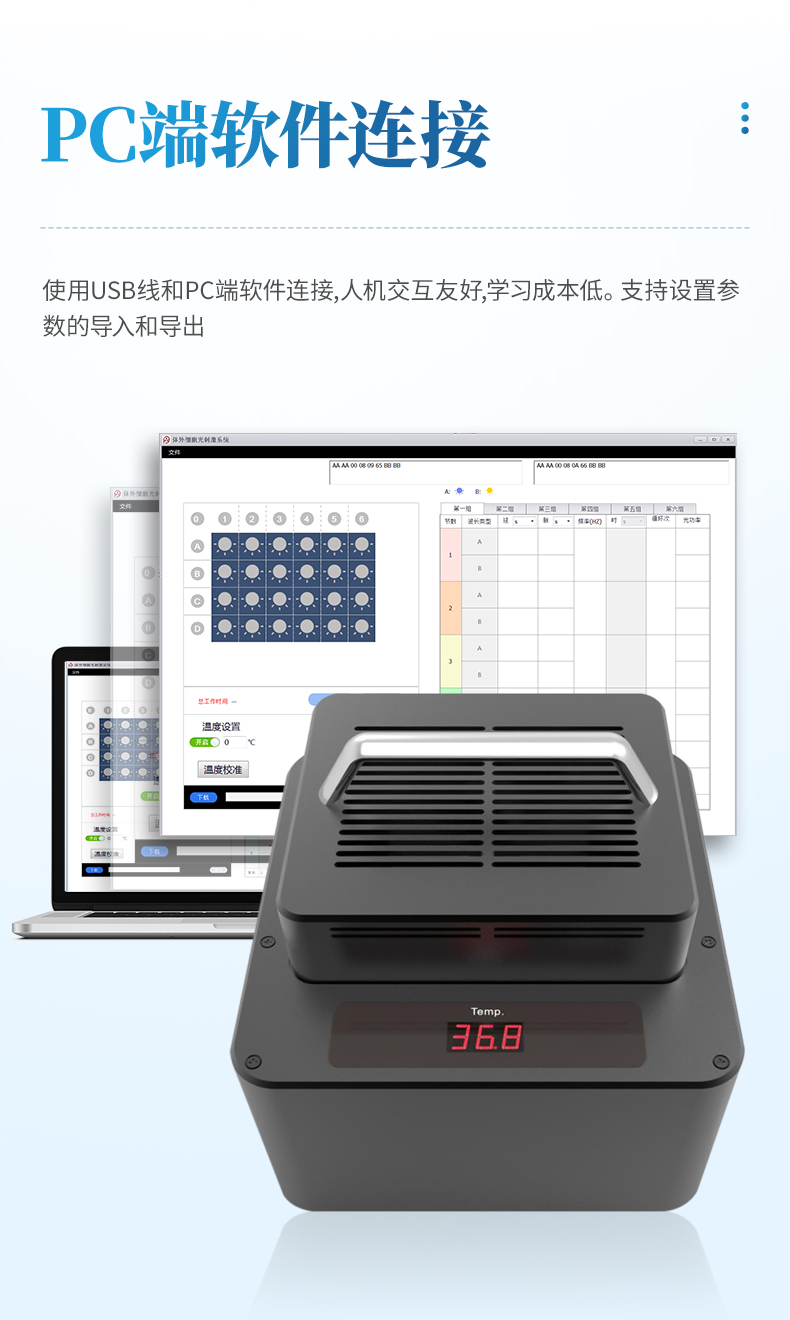 使用USB線和PC端軟件連接,人機(jī)交互友好,學(xué)習(xí)成本低。支持設(shè)置參數(shù)的導(dǎo)入和導(dǎo)出。