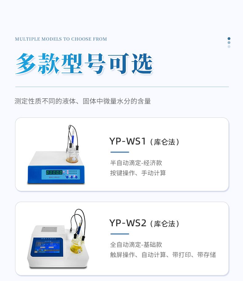 YP-WS1型微量水分測(cè)定儀根據(jù)卡爾-菲休滴定原理,采用先進(jìn)的微機(jī)電路,測(cè)定性質(zhì)不同的液體、固體中微量水分的含量。對(duì)于不溶于試劑的固體,以及與試劑起化學(xué)反應(yīng)的或容易污染電極的物質(zhì),可配用相應(yīng)的固體、液體進(jìn)樣器,進(jìn)行間接測(cè)定。