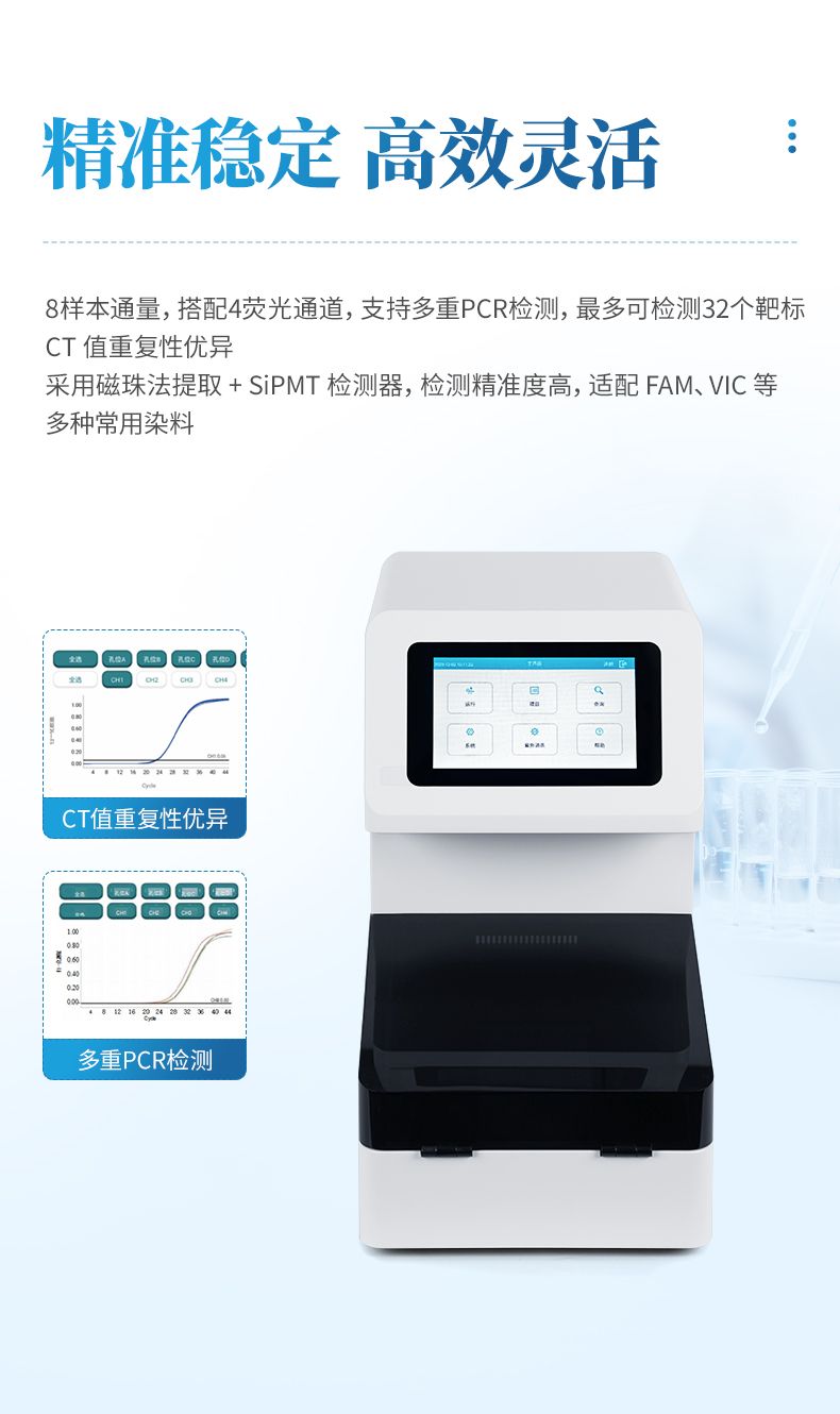 全自動(dòng)核酸檢測(cè)設(shè)備是一款集核酸提取、 PCR擴(kuò)增以及熒光檢測(cè)于一體。儀器配合通用磁珠法核酸提取試劑和熒光定量PCR試劑,一次實(shí)驗(yàn)可支持8個(gè)樣本的QPCR檢測(cè)。用戶只需加入樣本,無(wú)需轉(zhuǎn)管,配液等復(fù)雜操作,可大大降低人工操作,