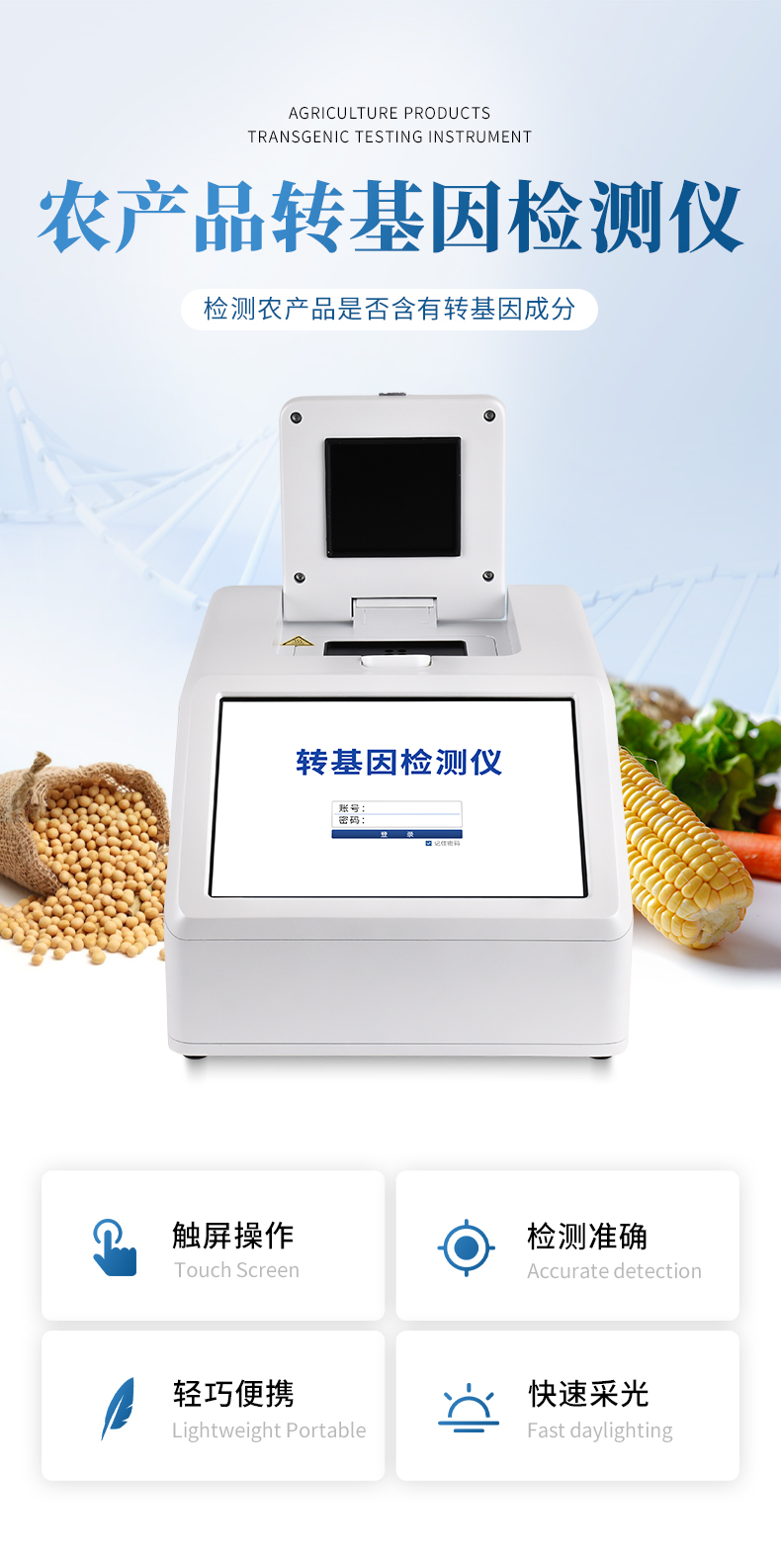 農(nóng)產(chǎn)品轉(zhuǎn)基因檢測(cè)儀是一種用于檢測(cè)農(nóng)產(chǎn)品是否含有轉(zhuǎn)基因成分的設(shè)備。轉(zhuǎn)基因農(nóng)產(chǎn)品是通過(guò)基因工程技術(shù)將外源基因?qū)氲睫r(nóng)作物中的產(chǎn)品。轉(zhuǎn)基因檢測(cè)儀的作用是幫助農(nóng)業(yè)生產(chǎn)者、食品加工廠(chǎng)以及監(jiān)管機(jī)構(gòu)等對(duì)農(nóng)產(chǎn)品進(jìn)行轉(zhuǎn)基因成分的快速檢測(cè)和鑒定。