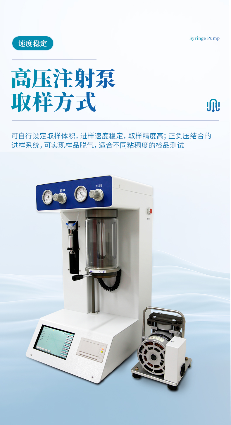 l正負(fù)壓結(jié)合的進(jìn)樣系統(tǒng),可實現(xiàn)樣品脫氣,適合不同粘稠度的檢品測試