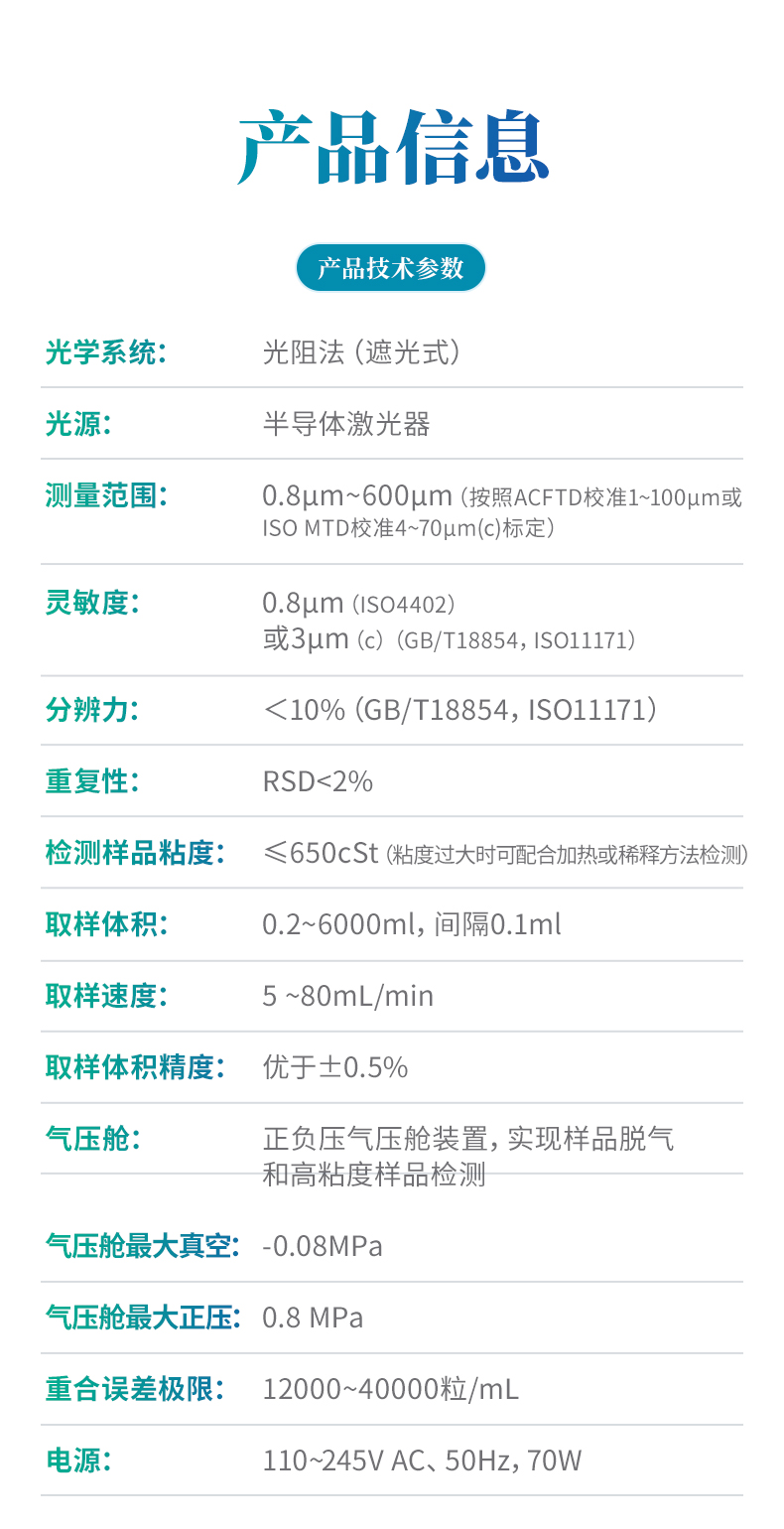 l粒徑范圍:0.8μm~600μm(按照ACFTD校準(zhǔn)1~100μm或ISO MTD校準(zhǔn)4~70μm(c)標(biāo)定)