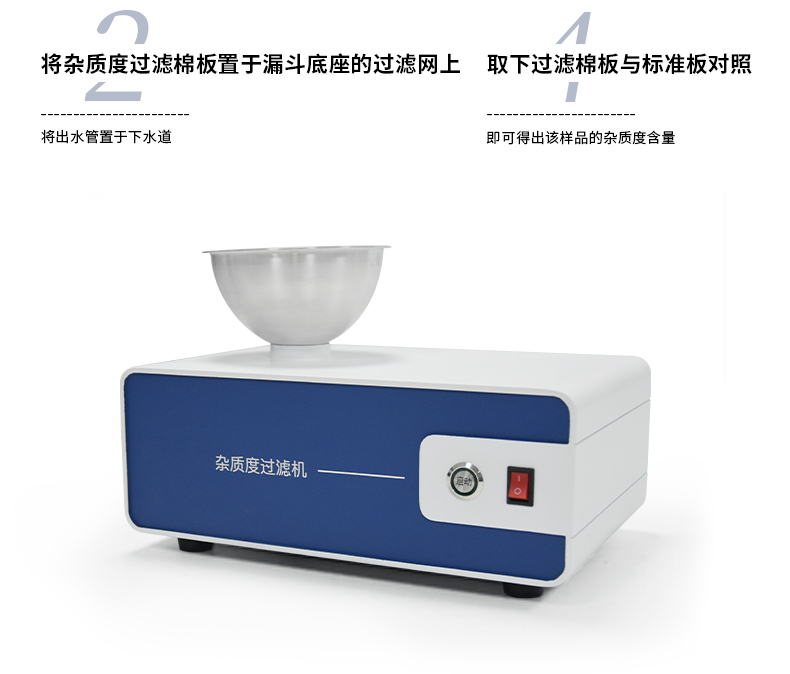 二 將雜質(zhì)度過濾棉板置于漏斗底座的過濾網(wǎng)上。將出水管置于下水道。