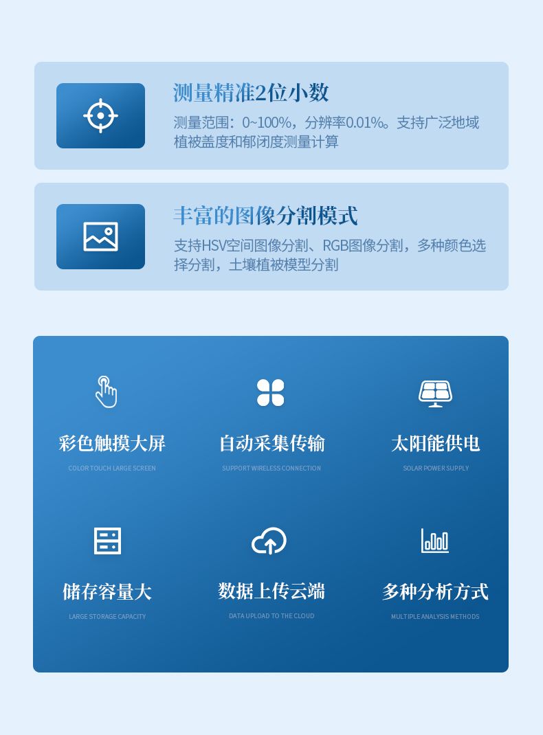 2. 測量范圍:0~100%,分辨率0.01%;支持HSV空間圖像分割、RGB圖像分割,多種顏色選擇分割,土壤植被模型分割。