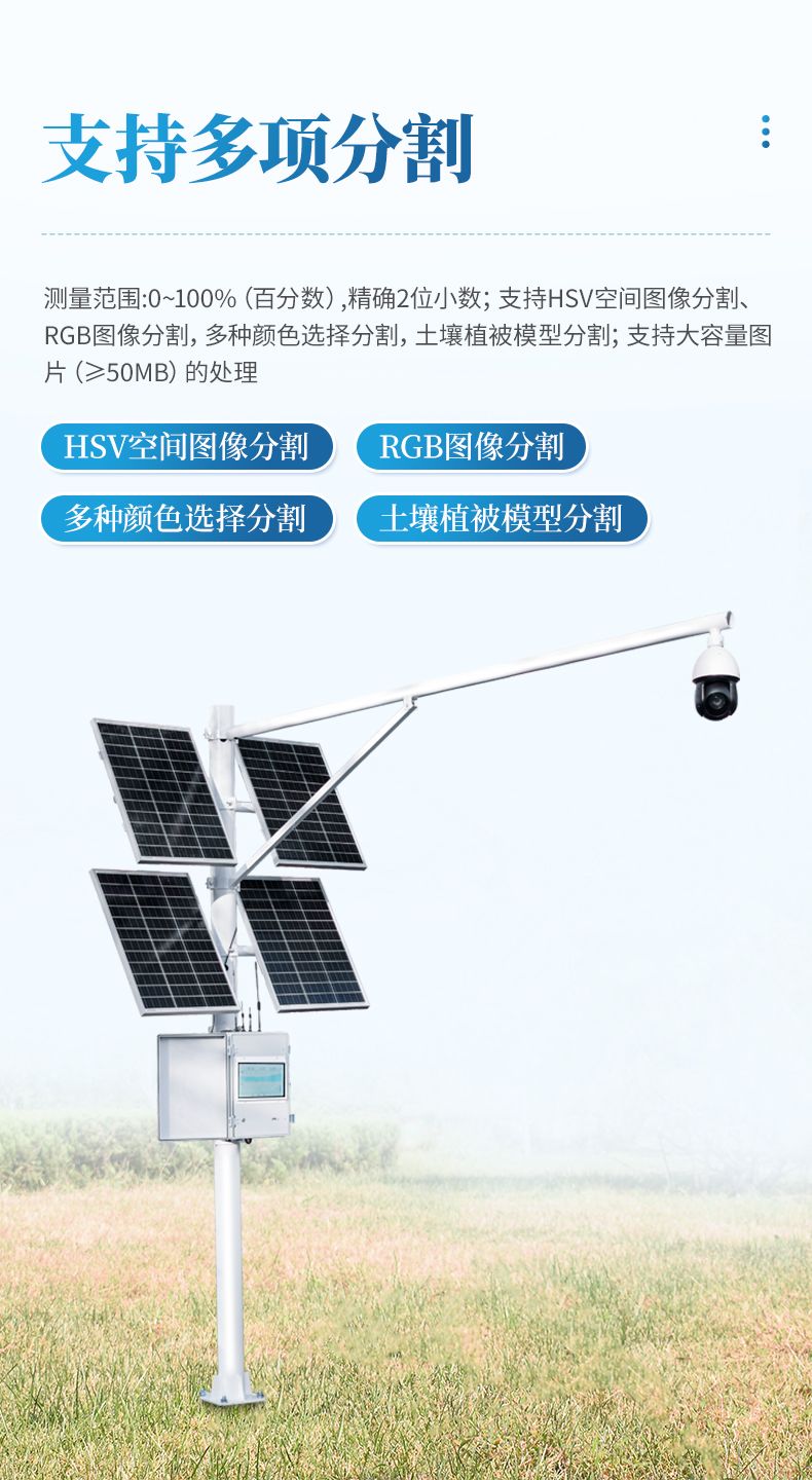 植被蓋度分析系統(tǒng)根據(jù)圖像識別原理來實(shí)現(xiàn)自動分析,用于植被覆蓋度和郁閉度的精確測量。儀器具有良好的防水性能,并帶有太陽能供電系統(tǒng),可在戶外環(huán)境下長期自動定時采集分析,獲取植被長期生長變化情況。