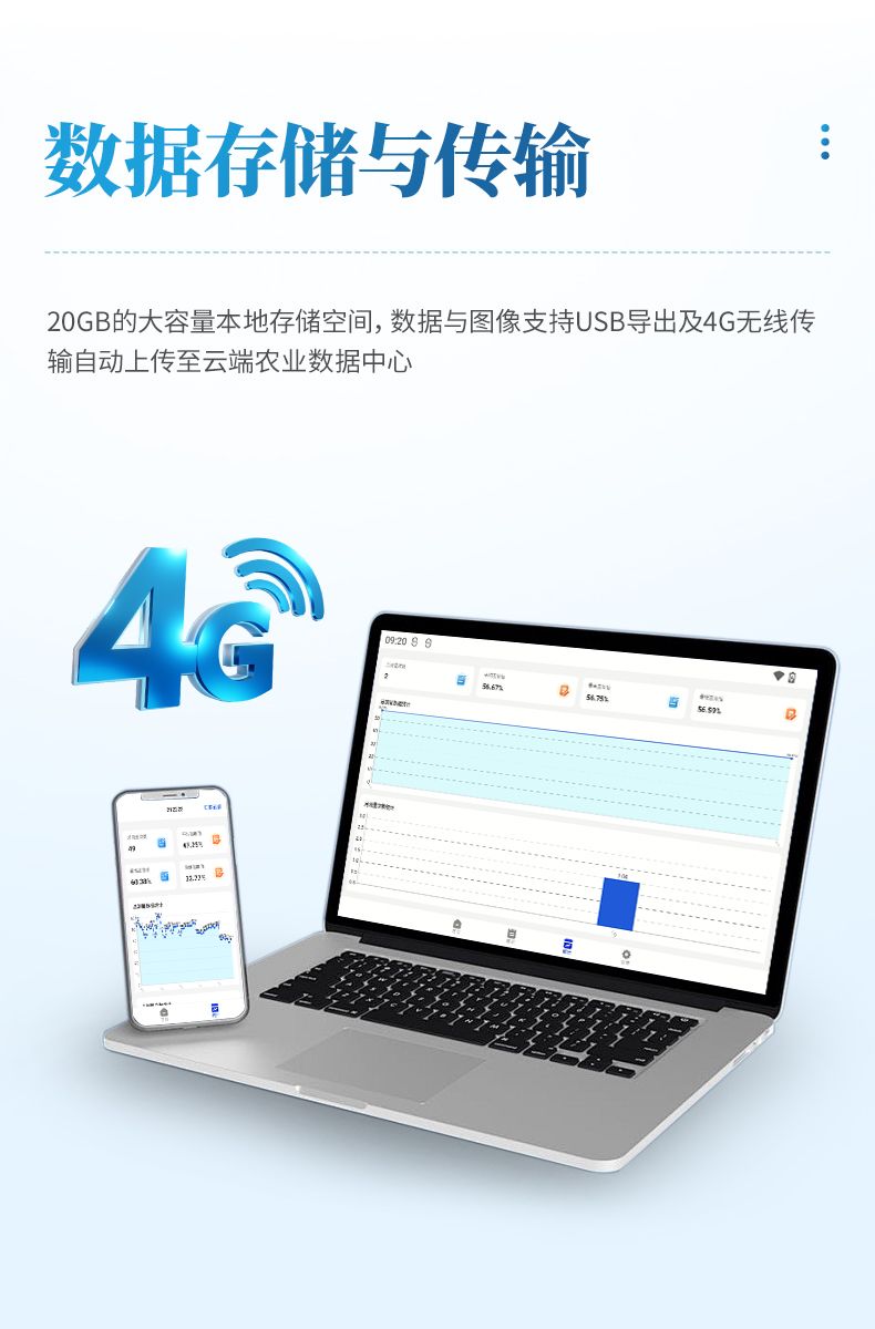 6. 數(shù)據(jù)存儲與傳輸:提供20GB的大容量本地存儲空間,數(shù)據(jù)與圖像支持USB導(dǎo)出及4G無線傳輸自動上傳至云端農(nóng)業(yè)數(shù)據(jù)中心,用戶可通過專用賬號訪問并以表格形式下載