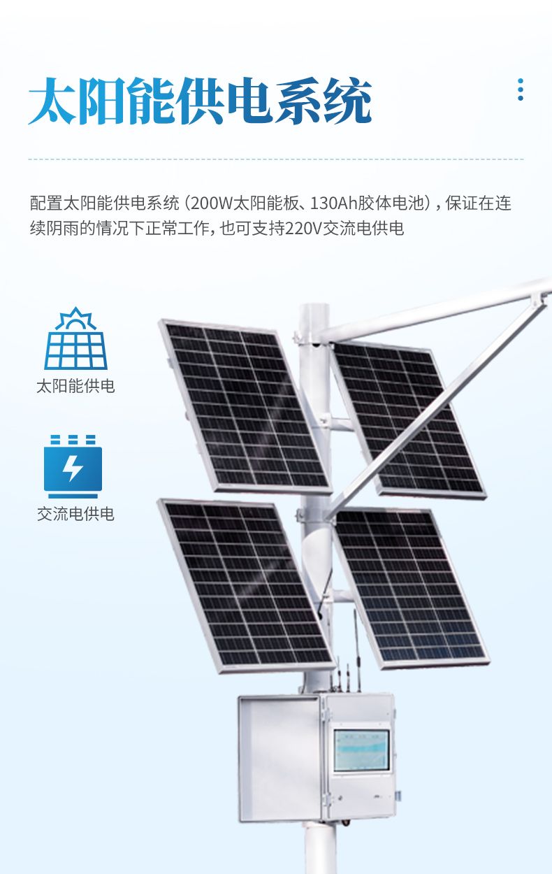 7. 配置太陽能供電系統(tǒng)(200W太陽能板、130Ah膠體電池),保證在連續(xù)陰雨的情況下正常工作,也可支持220V交流電供電
