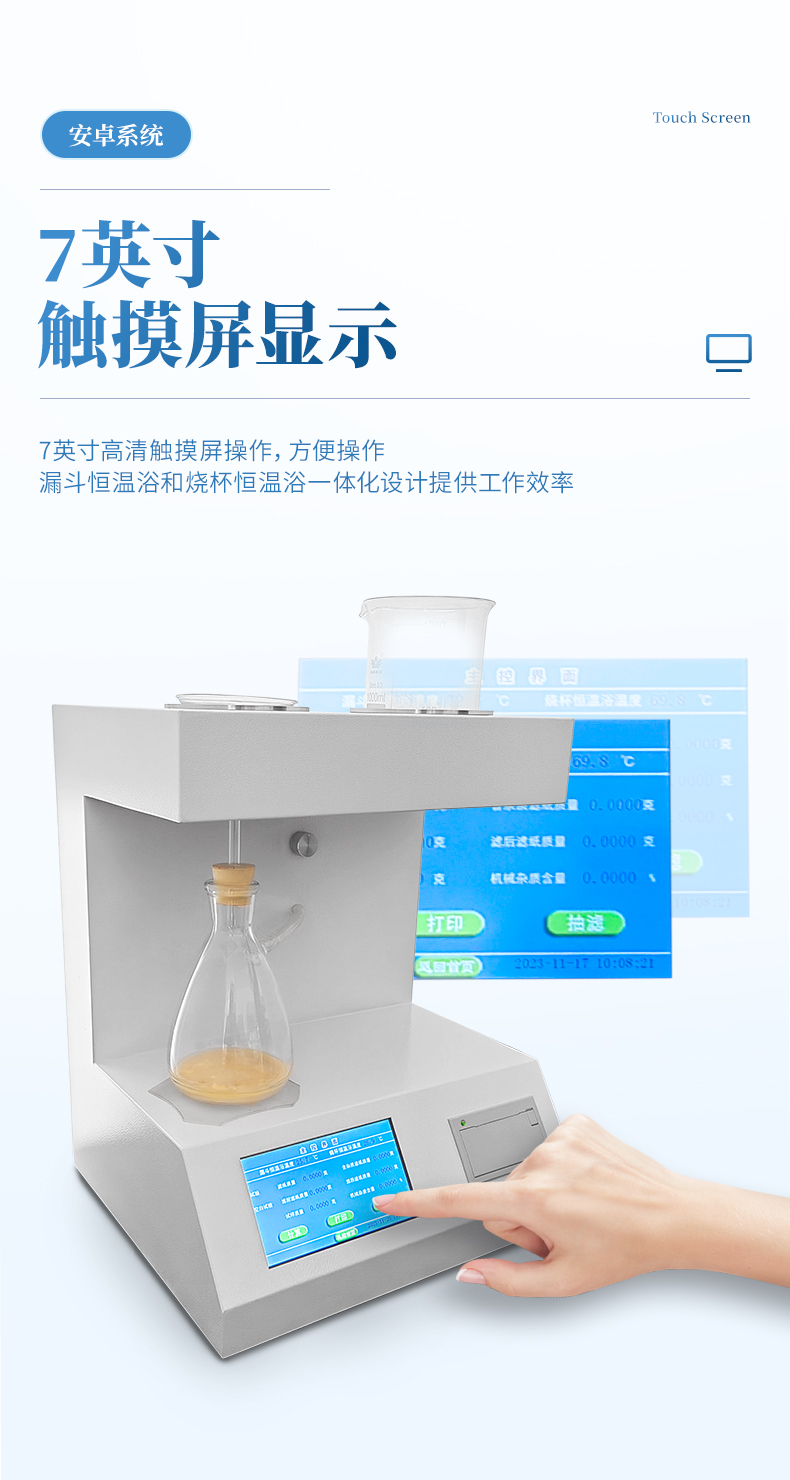 1.7寸高清觸摸屏操作,方便操作,漏斗恒溫浴和燒杯恒溫浴一體化設(shè)計(jì)提供工作效率