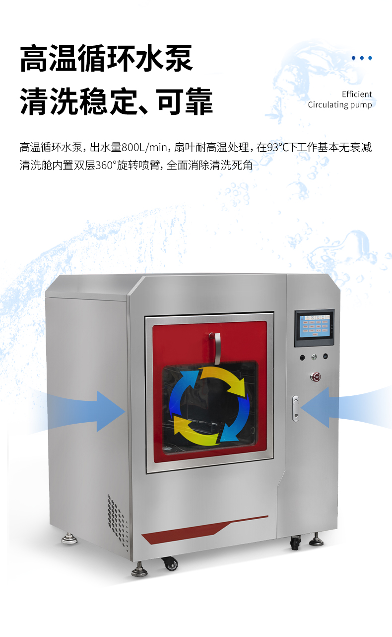*4.1 清洗水泵為專業(yè)歐洲原裝循環(huán)泵,出水量430L/min,出水量大,沖刷力大。循環(huán)泵扇葉做了耐高溫處理,可以在消毒水溫下(93℃以上)正常工作。