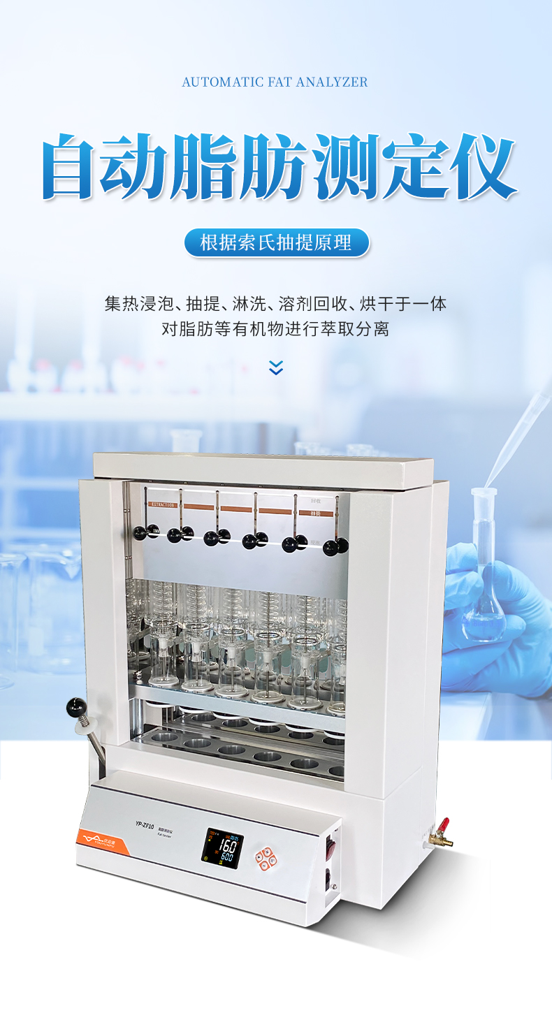 自動(dòng)脂肪測定儀(索氏提取儀)是根據(jù)索氏抽提原理,集熱浸泡、抽提、 淋洗、溶劑回收、烘干于一體,對(duì)脂肪等有機(jī)物進(jìn)行萃取分離的儀器。儀器采用了自 動(dòng)控溫、全封閉井式電加熱形式,使儀器加溫更為均勻,安全可靠,并具有良好的密 封設(shè)施,從而達(dá)到快速準(zhǔn)確的目的;最大限度降低溶劑用量,自動(dòng)回收溶劑,節(jié)省分 析成本。具有設(shè)計(jì)合理、操作簡單、精確度高、性能穩(wěn)定、重現(xiàn)性 好、省力、省時(shí)等優(yōu)點(diǎn)。