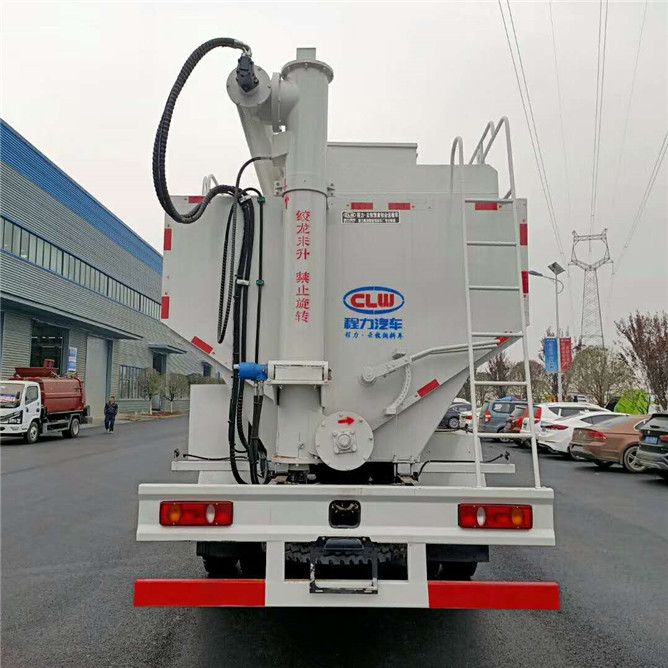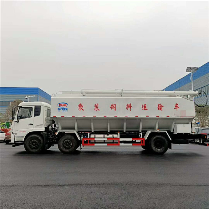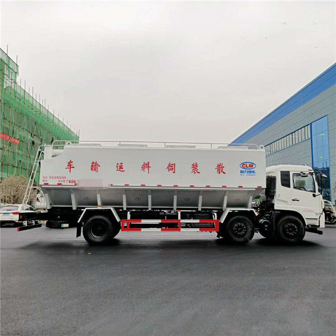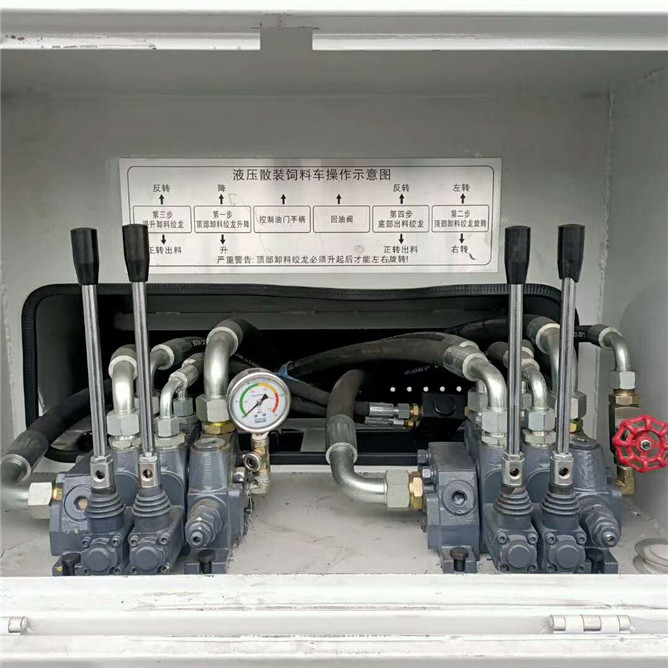 散裝飼料運輸車罐體材質(zhì)采用4mm優(yōu)質(zhì)碳鋼,整車3條絞龍,由3個5.5KW電機帶動,頂部絞龍用液壓控制舉升,可左右旋轉(zhuǎn)180°。罐體可根據(jù)用戶要求做多個獨立分倉,可以獨立控制各分倉卸料順序和速度。