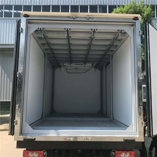內(nèi)外優(yōu)質(zhì)玻璃鋼板,中間高密度保溫層,廂體厚度8CM,門鎖鉸鏈不銹鋼成型件,鋁合金型材包邊,地板鋁花紋板。