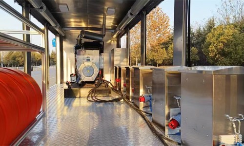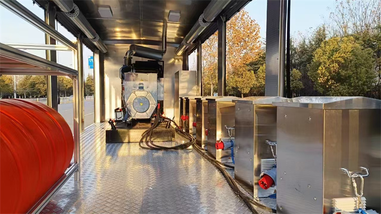 廂體部分:采用一體化鋼體結(jié)構(gòu)設(shè)計(jì)廂體,具備運(yùn)輸、防雨、防火、阻燃、防塵、防銹、降噪、隔震等功能。移動(dòng)電源系統(tǒng)匹配東風(fēng)康明斯250kw發(fā)電機(jī)組及智能控制系統(tǒng),并可對(duì)外輸出220V/380V電壓。搭載8臺(tái)便攜式軸流潛水泵,單臺(tái)排量500立方/小時(shí)。4套一拖二水泵控制系統(tǒng),可視化操作界面,實(shí)施監(jiān)測(cè)運(yùn)行數(shù)據(jù)。4套液壓支撐系統(tǒng),單套靜載荷6噸。車頂升降照明燈一套,遙控距離25米,升降高度2.5米。野外休息室一套,配備頂部空調(diào)、長(zhǎng)形座椅、工作臺(tái)、飲水機(jī)等生活保障設(shè)備。