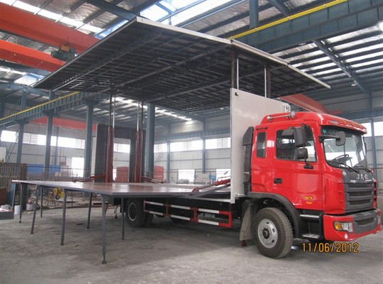 。駕駛室?guī)ХD(zhuǎn),燃油種類為:柴油 排放標(biāo)準(zhǔn)為:國(guó)三,跟據(jù)用戶使用需求可加裝駕駛室空調(diào)和方向助力。 側(cè)面展開(kāi)為:1車廂頂部半掀開(kāi),側(cè)廂體放下作為舞臺(tái)板,2邊廂和車廂頂部二分之一同掀起,內(nèi)藏式舞臺(tái)板(可選擇) 兩面展開(kāi)為:左右?guī)w升起隨液壓缸升至1.3----1.5米左右,內(nèi)藏式舞臺(tái)板,液壓展開(kāi). 三面展開(kāi)為: 左右?guī)w升起隨液壓缸升 至1.3----1.5米左右,左右內(nèi)藏式舞臺(tái)板,液壓展開(kāi),后門和雨延自動(dòng)放下和伸出(作為遮陽(yáng)和防雨) 整車為全液壓操作,安全可靠,操作簡(jiǎn) 便,維護(hù)省心,只需十分鐘,就可完成全部搭臺(tái)布景工作,省力省心看得見(jiàn),是各個(gè)劇團(tuán)的好幫手。 | |||