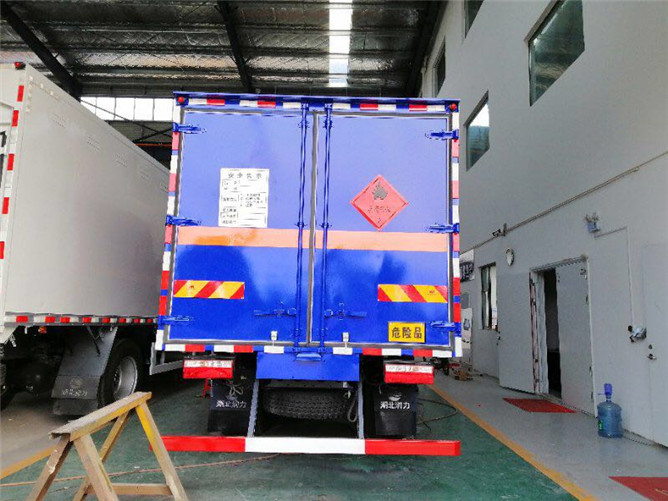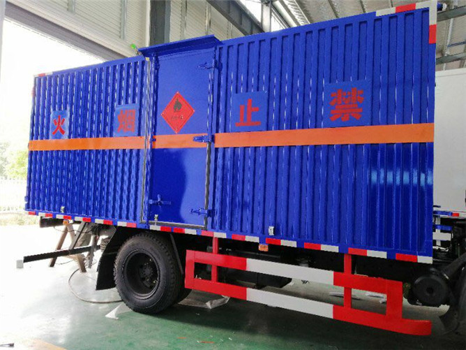 氣瓶運(yùn)輸車箱體為危險(xiǎn)品欄板結(jié)構(gòu),欄板為骨架式結(jié)構(gòu),外部鋪設(shè)冷板,欄板上安裝可拆卸防護(hù)高欄,車身側(cè)面及后部粘貼反光標(biāo)識(shí)、易燃?xì)怏w標(biāo)示、車體后部設(shè)置危險(xiǎn)標(biāo)志牌。