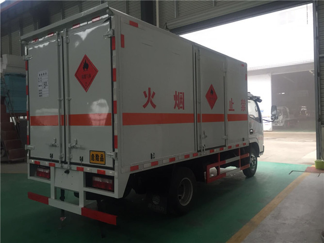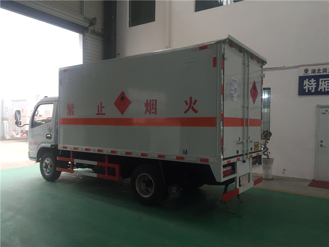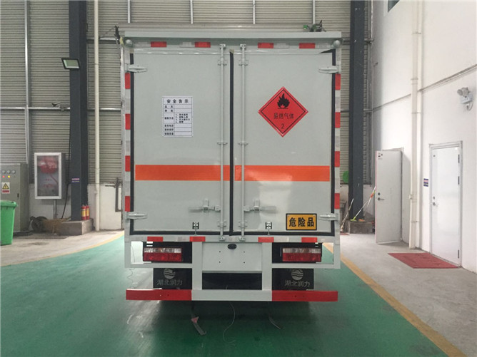 氣瓶運輸車箱體為危險品欄板結(jié)構(gòu),欄板為骨架式結(jié)構(gòu),外部鋪設(shè)冷板,欄板上安裝可拆卸防護高欄,車身側(cè)面及后部粘貼反光標(biāo)識、易燃?xì)怏w標(biāo)示、車體后部設(shè)置危險標(biāo)志牌。