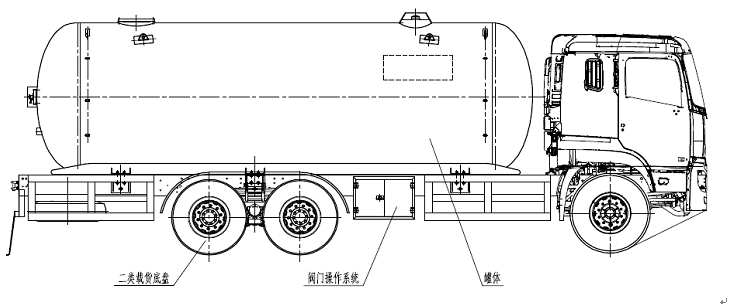 我公司設(shè)計的液化氣體運輸車(以下簡稱運輸車)是由下列部份組成:二類載貨車底盤、罐體、各種安全裝置及其它附件。