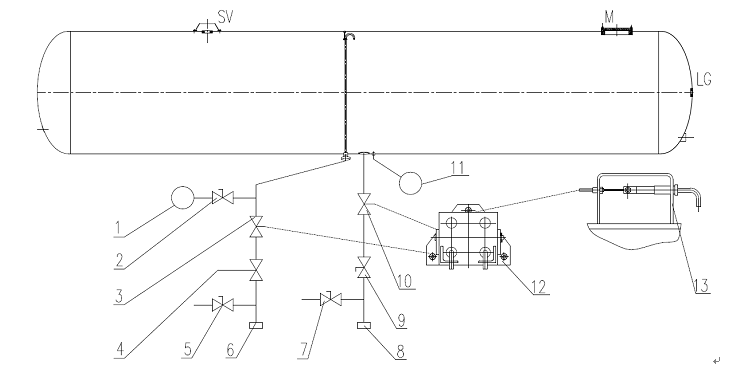 ④充裝完畢后,操作手動控制裝置,關(guān)閉氣、液相緊急切斷閥;關(guān)閉氣、液相閥門(4、9);關(guān)閉氣站端靠近專用裝卸管的閥門。