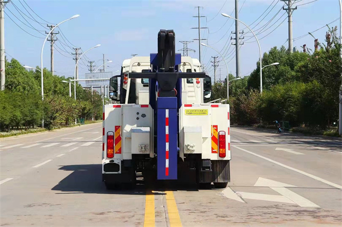 此款清障車配置重汽豪沃駕駛室,搭載德國(guó)曼310馬力發(fā)動(dòng)機(jī),軸距為6050毫米,可實(shí)現(xiàn)一拖一,國(guó)六排放標(biāo)準(zhǔn),帶空調(diào)、中控、遙控,配置16噸后托臂,雙8噸卷?yè)P(yáng),拖牽質(zhì)量約50T左右。
