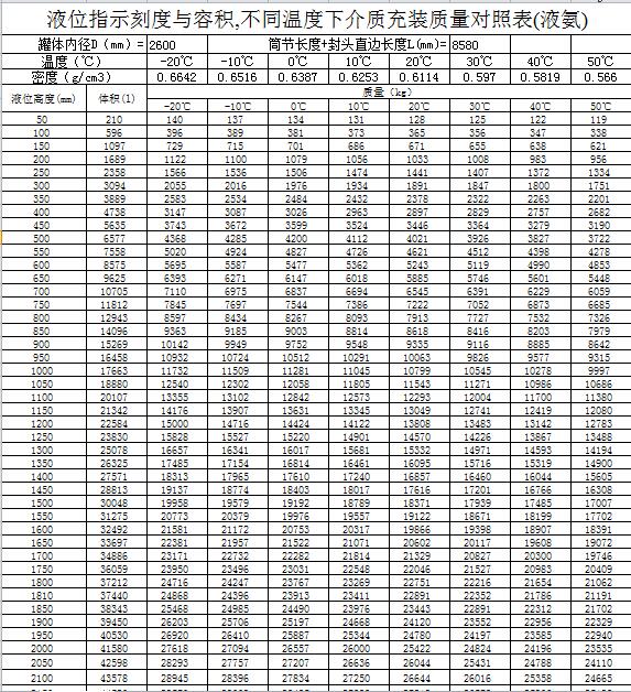 上表可以看出,是以每50毫米為單位的各液位高度對(duì)應(yīng)的液氨儲(chǔ)罐內(nèi)液體的重量,且零下20度至50度,不同溫度對(duì)應(yīng)的重量也不一樣。且此50立方液氨儲(chǔ)罐直徑為2600毫米,是最優(yōu)的一種規(guī)格。
