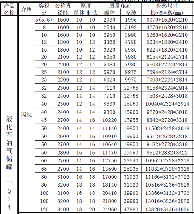 儲罐一般按容積劃分規(guī)格型號,我公司根據(jù)市場上用戶的需要,結(jié)合實際生產(chǎn)經(jīng)驗,制定了一個比較完整的液化氣儲罐型號表,從5立方至120立方的儲罐均有,供大家在建液化氣站,更換儲罐設(shè)備時選擇。