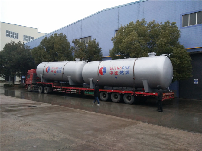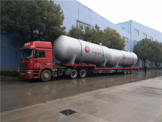 50立方液化氣儲(chǔ)罐總長(zhǎng)9.2米,用一臺(tái)17.5米的半掛車(chē)剛好可以裝兩臺(tái)。經(jīng)過(guò)一個(gè)小時(shí)左右的吊裝作業(yè),兩臺(tái)儲(chǔ)罐順利的裝上運(yùn)輸車(chē),罐體上的“中國(guó)燃?xì)狻盠OGO鮮亮而美麗,激勵(lì)著我們給用戶(hù)做出更好的產(chǎn)品。