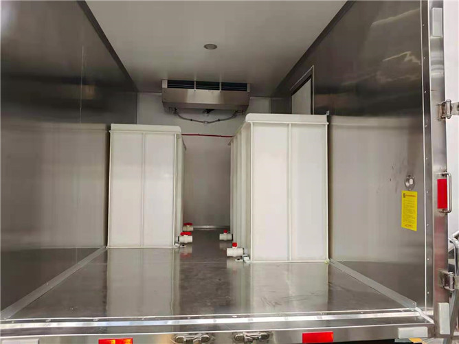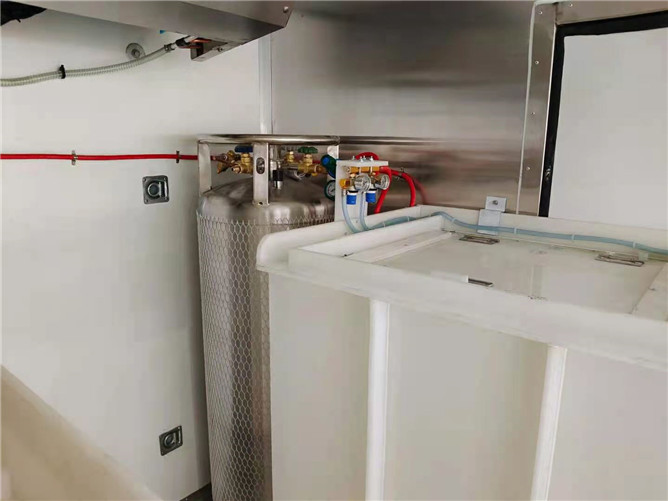 由于運(yùn)輸生鮮的特殊性,些款冷藏車與普通的相比,加裝了鮮活魚箱及杜瓦罐,可以及時(shí)對(duì)箱內(nèi)的魚產(chǎn)進(jìn)行供氧。