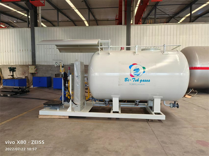 此臺(tái)5立方LPG撬裝站是應(yīng)國(guó)外客戶要求設(shè)計(jì)制造,配備一臺(tái)泵、一臺(tái)秤(英文界面)、罐體上方裝有噴淋管(溫度過高時(shí)可起降溫作用),充裝間配有遮陽(yáng)棚,罐體上開別開有氣相、液相進(jìn)出口和回流口接管,整體管線設(shè)計(jì)優(yōu)美,功能完備,且安全可靠,是我公司一款較為成熟的移動(dòng)式壓力容器產(chǎn)品。